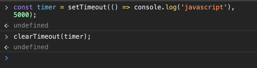 위의 코드를 실행하면 'javascript'라는 문자열은 콘솔에 찍히지 않습니다. 왜냐하면 타임아웃이 끝나기 전에 clearTimeout으로 취소를 해버렸기 때문입니다.
