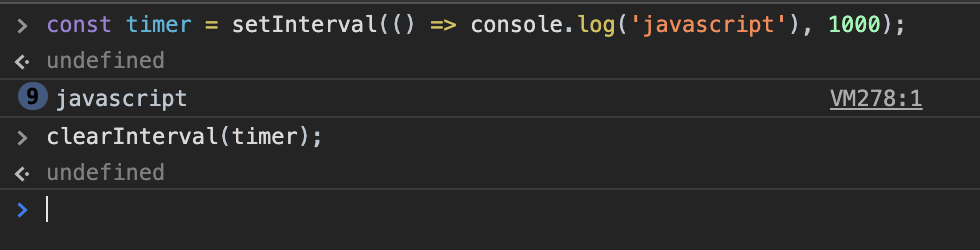위의 clearInterval로 1초마다 로그를 찍는 코드를 아무때나 종료할 수 있습니다.