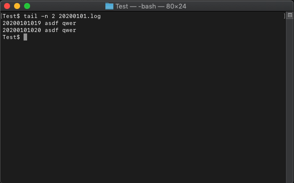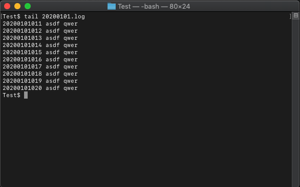 20200101.log 파일은 20줄 짜리 텍스트 문서입니다. tail의 기본 기능은 파일의 마지막 10줄만 출력하고 종료합니다.