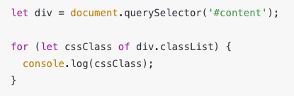 위 코드는 먼저 querySelector() 메소드를 통해 id가 content인 div element를 가져옵니다. 그다음 element의 classList에 루프를 돌려 각각의 클래스명을 콘솔에 출력합니다.