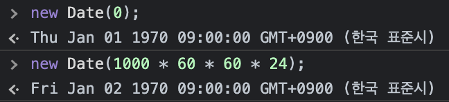 자바스크립트의 Date 객체는 기본적으로 UTC 1970년 1월 1일 부터 경과된 시간을 밀리초로 저장합니다. 여기서 1970년 1월 1일을 epoch 이라고 하는데 new Date(milliseconds) 메소드는 매개변수로 받은 값을 epoch에 더해서 epoch 이후로 특정 밀리초가 경과한 시간을 지정할 수 있습니다.