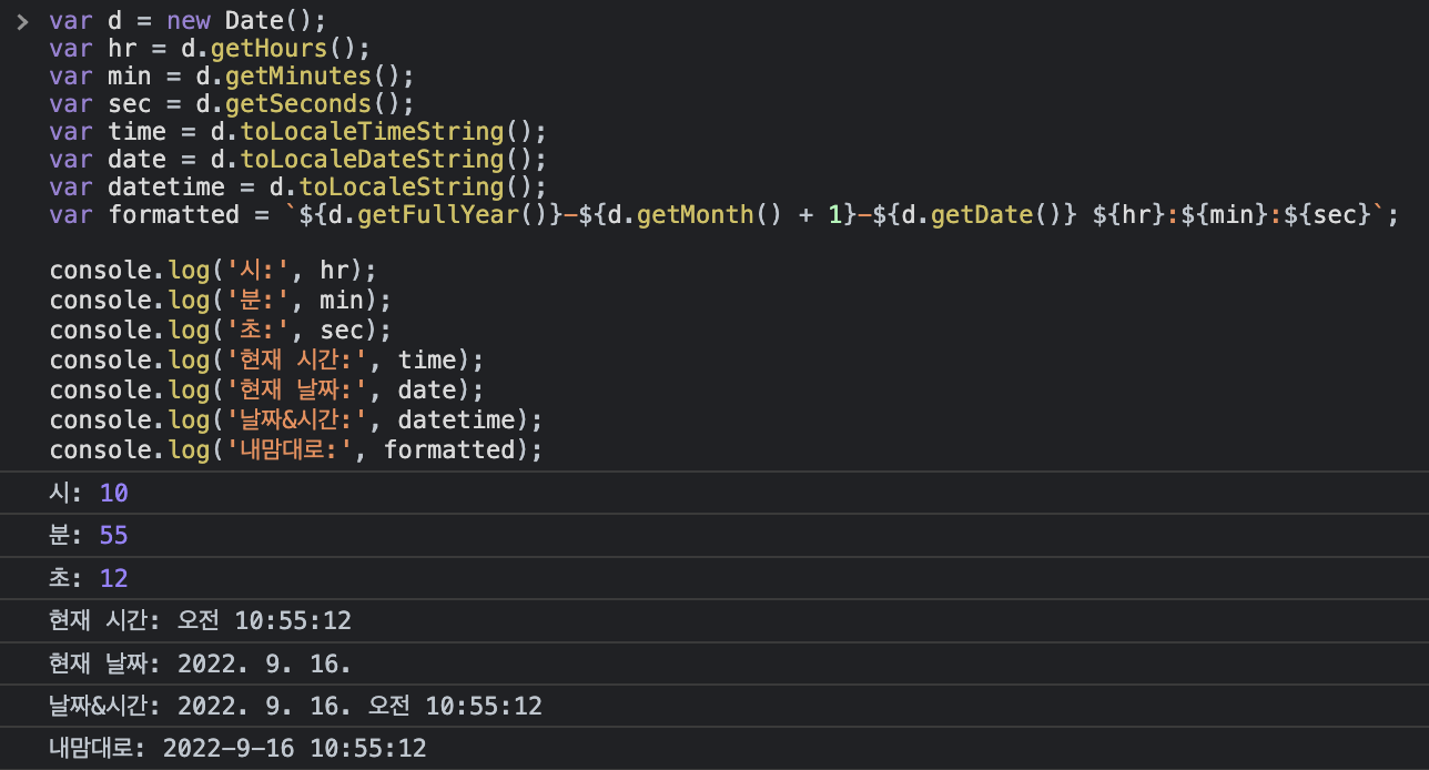 위와 같이 Date 객체의 다양한 메소드를 통해 날짜와 시간에 해당하는 각각의 요소를 가져온 다음 원하는 형태로 조합하여 사용하면 거의 모든 부분에서 문제없이 날짜와 시간을 표시할 수 있습니다.