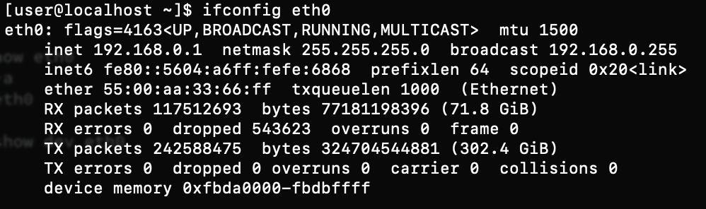 ifconfig 명령어는 IP 관련 정보를 보는 데 사용하는 또 다른 명령어 입니다. 이 명령어를 사용하여 IP 주소를 찾으려면 프롬프트에 "ifconfig -a"를 입력하고 특정 인터페이스(eth0)만을 보기 원한다면 "ifconfig eth0" 을 입력하면 됩니다.