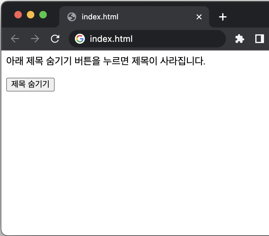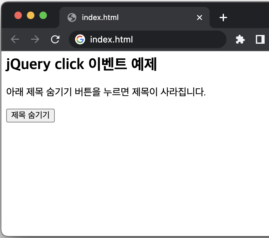 이렇게 동작하는 이유는 버튼의 click() 메소드에 hide() 메소드를 사용해 h2 태그를 숨기는 함수를 추가했기 때문입니다.