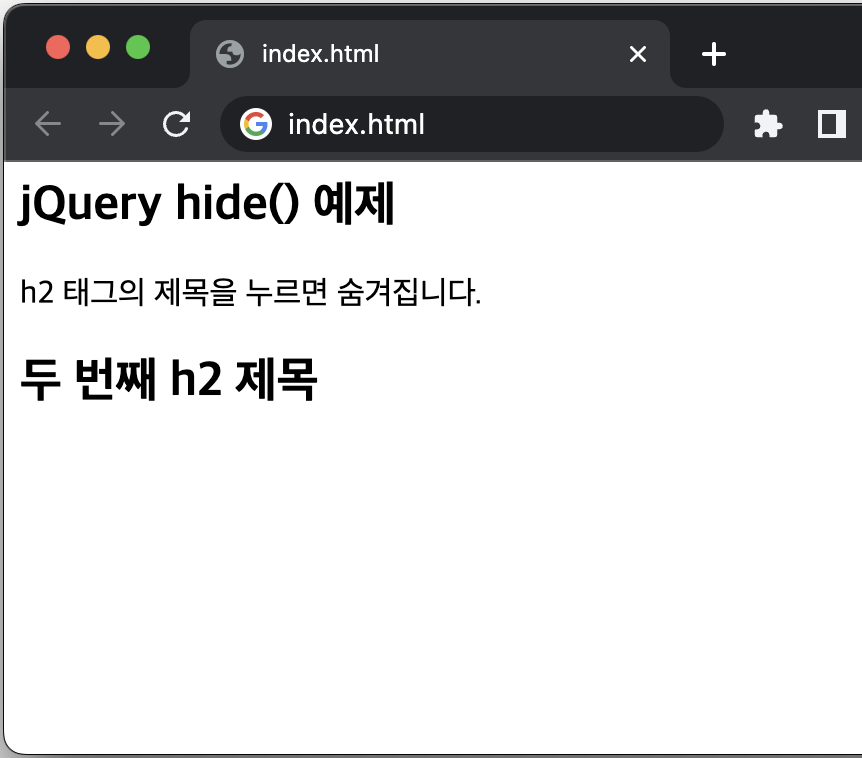 jQuery hide() 메소드는 선택한 HTML 항목을 숨깁니다. 다음은 제목을 누르면 제목이 숨겨지는 예제입니다. index.html에 다음 코드를 입력하고 실행합니다.