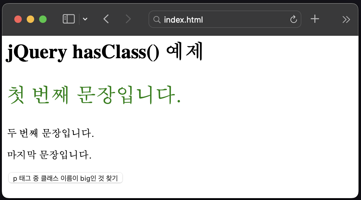다음의 예제는 big 이라는 클래스 이름이 문장에 추가되어있고, 버튼 클릭 이벤트가 발생하면 hasClass() 메소드를 사용하여 화면에 표시된 문장 중 big 이라는 클래스 이름이 포함된 문장이 있는지 확인합니다.