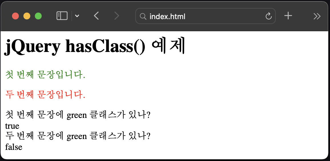 여기서 classname은 확인할 클래스 이름입니다. 이 메소드는 선택자로 선택된 HTML 항목이 classname을 가지고 있을 경우 true를 리턴합니다.