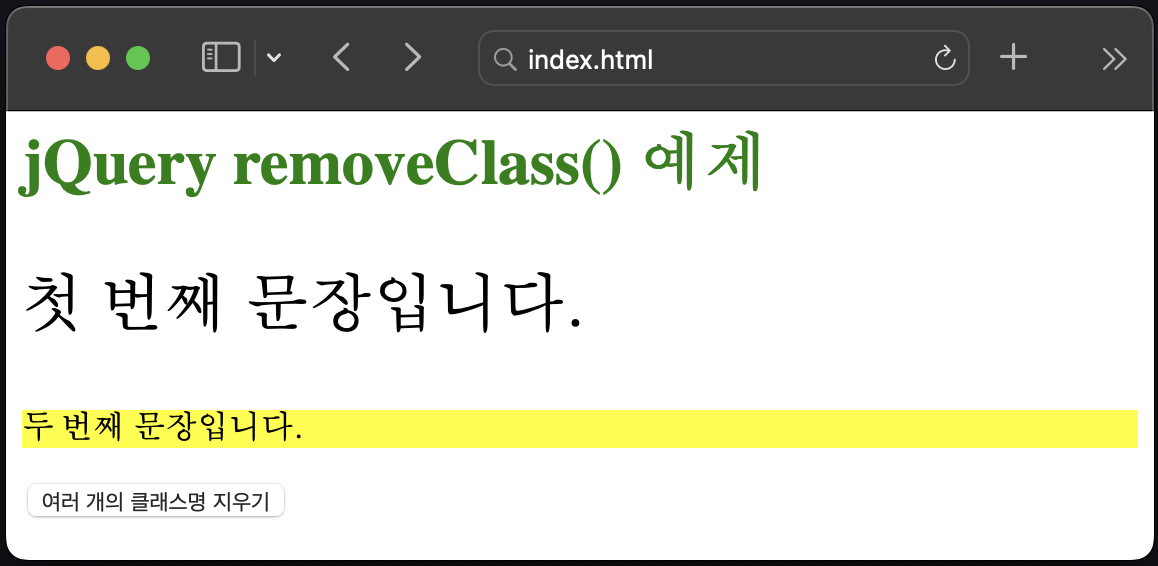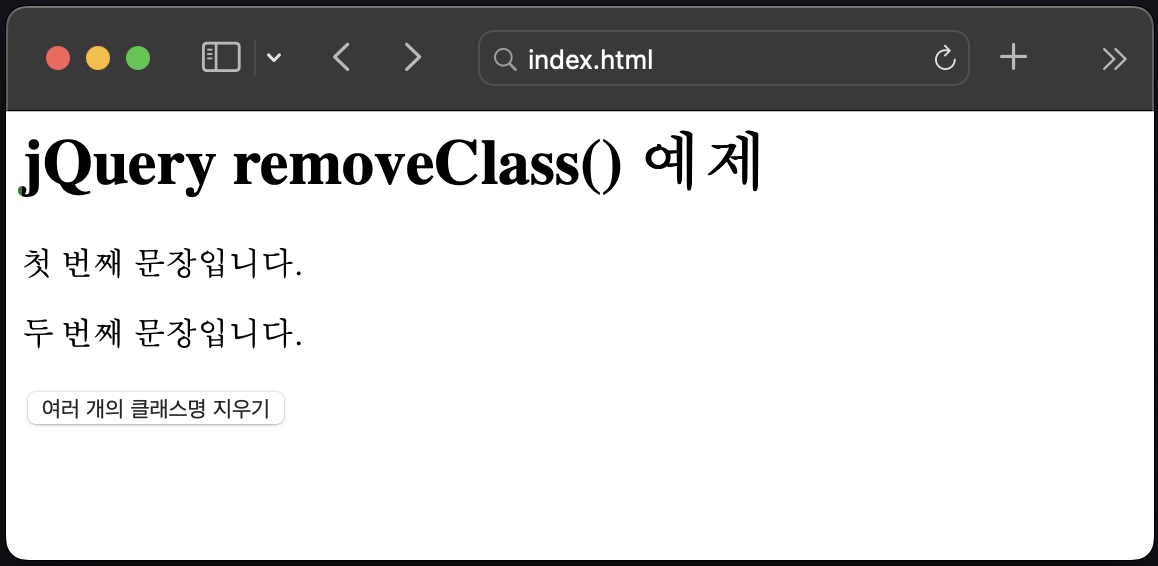 classname1, classname2 등은 선택된 HTML 항목에서 지울 클래스 이름입니다. 매개변수로 하나 이상의 클래스 이름을 전달할 수 있는데 공백으로 분리된 문자열을 전달하면 됩니다.