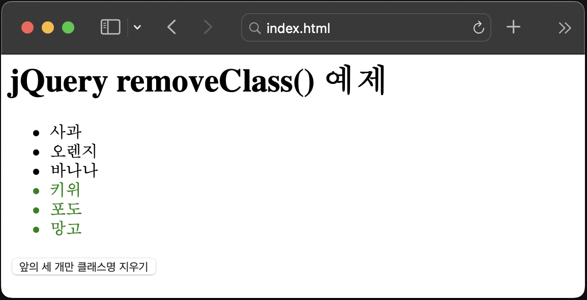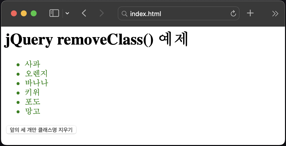 여기서 아래 쪽의 버튼을 누르면 과일 목록 중 앞의 세개만 클래스가 지워진 것을 확인할 수 있습니다.