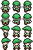 이미지의 각각의 행은 애니메이션 사이클을 나타냅니다. 첫 번째(맨 위) 행은 아래방향을 바라보고 걷는 캐릭터이고, 두 번째 행은 위를 바라보고 걷는 캐릭터이고, 세 번째 행은 왼쪽으로 네 번째 행은 오른쪽으로 걷는 캐릭터입니다. 기술적으로 왼쪽 열은 스탠딩(애니메이션 없음)이고 가운데 열과 오른쪽 열은 애니메이션 프레임 입니다. 각 행의 세 개의 프레임 정도면 부드러운 보행을 하는 애니메이션으로 만들 수 있을 것 같습니다.