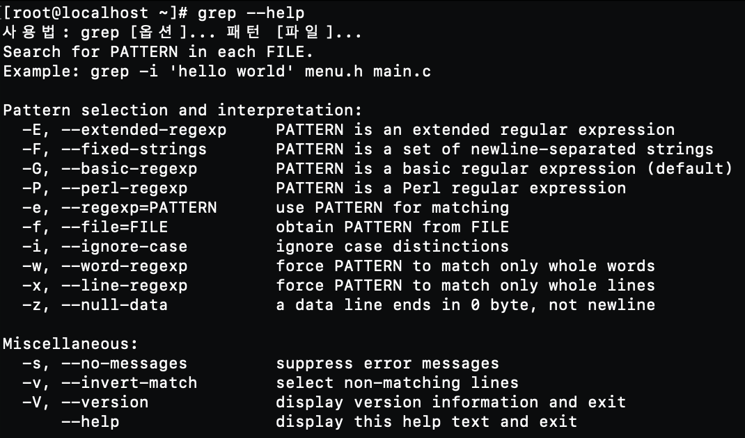 - <pattern> - 검색하려는 텍스트나 패턴입니다. 패턴은 정규식을 사용하여 지정할 수 있습니다.
