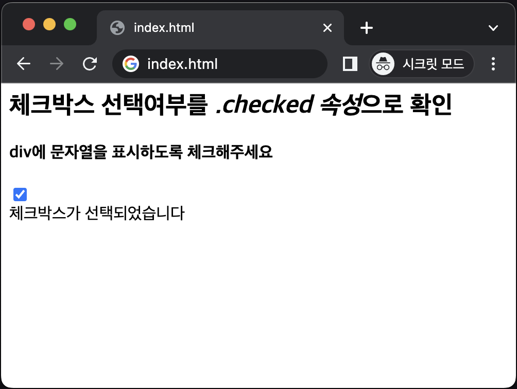 <h2>체크박스 선택여부를 <i>.checked 속성</i>으로 확인</h2>