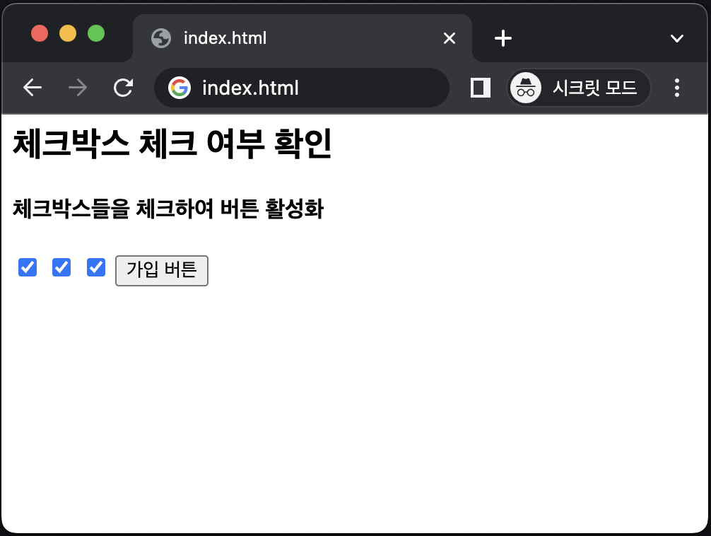 위의 코드를 실행하고 모든 체크박스를 체크하면 버튼이 활성화되고, 그렇지 않으면 버튼은 비활성화 상태로 유지됩니다.