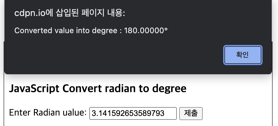 다음 예제에서는 사용자 입력에서 라디안 값을 가져오고 위의 공식을 사용해 산술 연산을 수행한 다음 alert 창에 결과를 표시합니다.