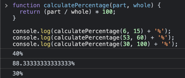 console.log(calculatePercentage(6, 15) + '%');