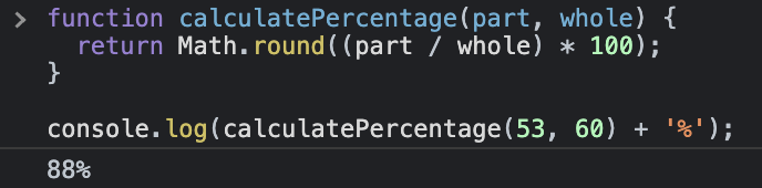 console.log(calculatePercentage(53, 60) + '%');