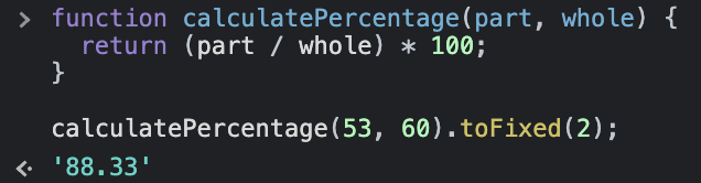 const fixedLengthOutput = calculatePercentage(53, 60).toFixed(2);