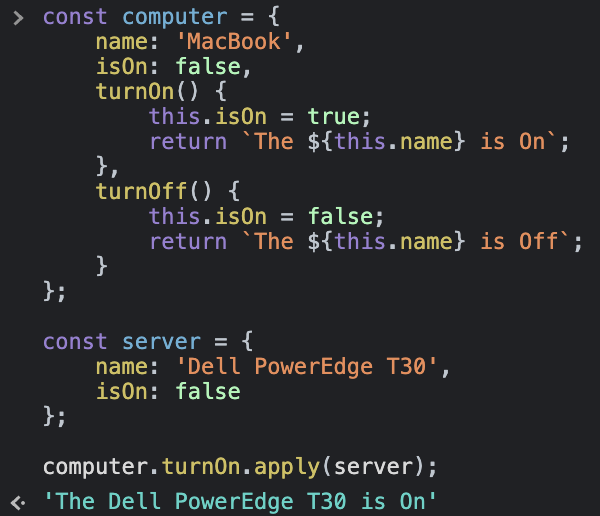 위의 예제에서는 server 객체가 computer 객체의 turnOn() 메소드를 빌렸습니다. 비슷하게 turnOff() 메소드를 빌려서 호출할 수 있습니다.