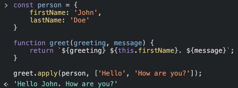 let result = greet.apply(person, ['Hello', 'How are you?']);