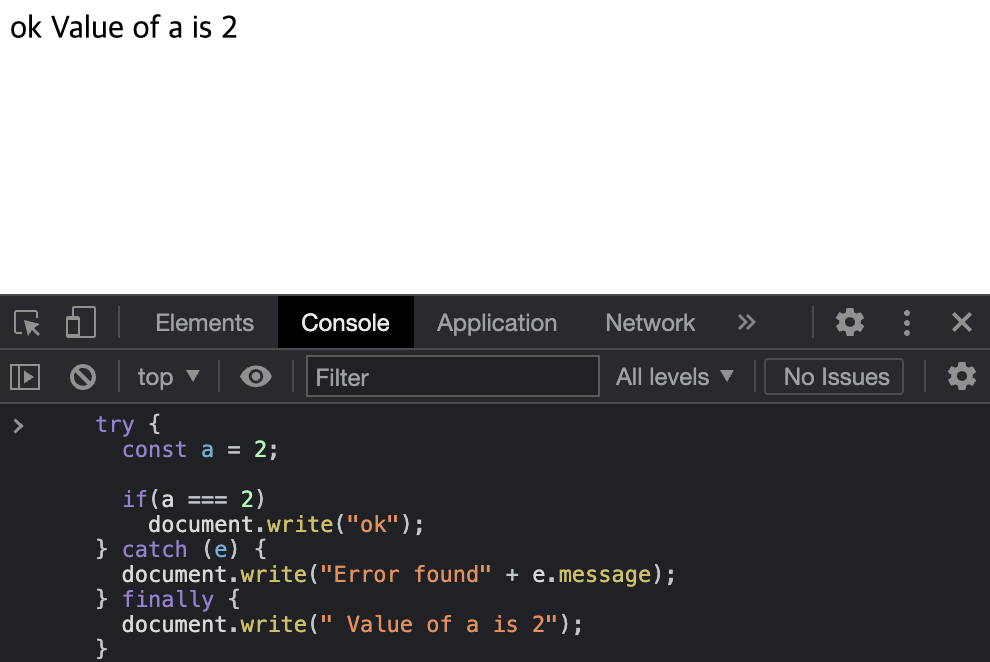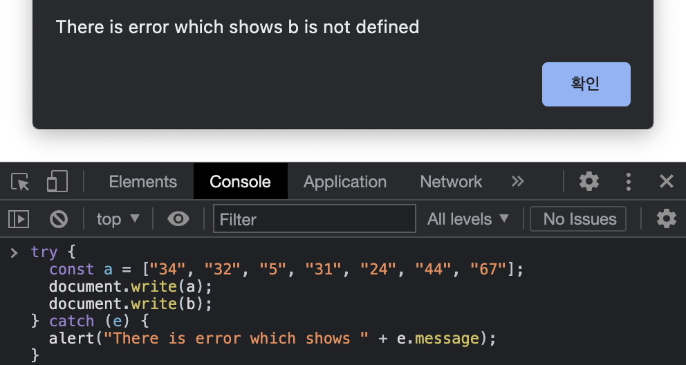catch{} 구문: 이 블록은 블록 내에 작성된 코드를 실행하여 오류를 처리합니다. 이 블록에는 사용자 정의 exception handler 또는 기본 제공 핸들러를 작성할 수 있습니다. 이 블록은 try 블록에서 에러가 발생한 경우에만 실행됩니다. 에러가 발생하지 않았다면 catch 블록은 건너뜁니다.