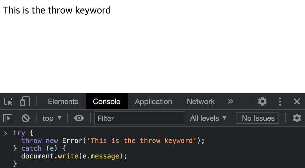 throw 문은 사용자 정의 에러를 발생시킬 때 사용합니다. 사용자는 자신이 정의한 에러를 발생시킬 수 있습니다. 일단 throw 문이 실행되면 이후의 구문은 실행되지 않습니다. 구문 실행은 catch 블록으로 바로 전달됩니다.