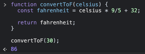 온도 변환을 위해 산술연산 공식으로 만들어 간단히 표현했습니다. fahrenheit 변수를 선언하고 결과 값을 만든 다음 리턴했습니다. fahrenheit 변수는 알고리즘이 수행하는 작업을 더 이해하기 쉽게 해주지만 반드시 필요한 것은 아닙니다. 위의 코드는 변수를 사용하지 않고 바로 리턴하도록 수정할 수도 있습니다.
