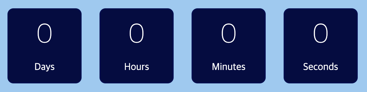 위의 예제에서 볼 수 있듯이 여기서는 웹 페이지의 배경에 #90cbf3를 사용했습니다. 이 페이지는 각각 일, 시간, 분, 초에 대한 네 개의 작은 상자가 있습니다. 먼저 HTML 및 CSS 파일을 만들어 보겠습니다.