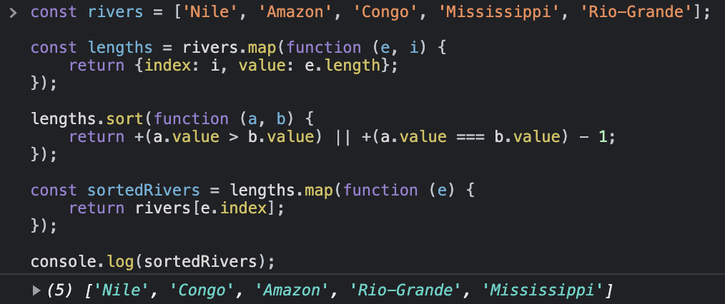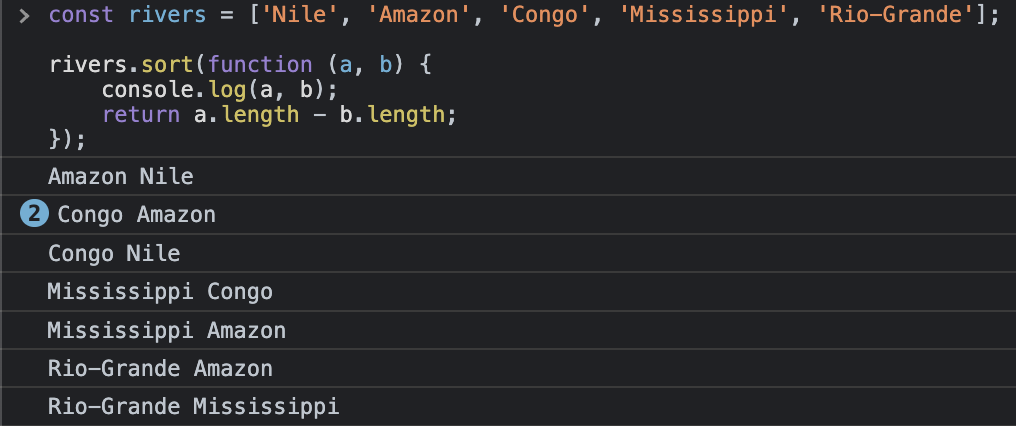 - sort() 메소드를 사용하여 요소의 길이를 기준으로 rivers 배열을 정렬합니다. sort() 메소드가 비교 함수를 호출할 때 마다 rivers 배열의 요소를 출력합니다.
