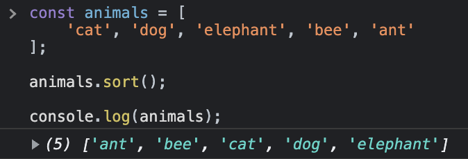 animals 배열의 요소를 알파벳 오름차순으로 정렬하려면 다음 예제와 같이 그냥 sort() 메소드에 매개변수를 주지 않고 사용하면 됩니다: