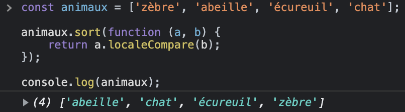const animaux = ['zèbre', 'abeille', 'écureuil', 'chat'];