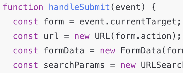이번 포스트에서는 submit 이벤트 핸들러가 있는 HTML form 요소를 사용하고, request body에 FormData 객체를 사용하는 편리한 방법을 알아봤습니다. 현재 handleSubmit 함수는 다음과 같아야 합니다: