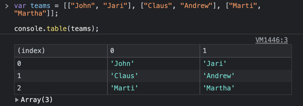 var teams = [["John", "Jari"], ["Claus", "Andrew"], ["Marti", "Martha"]];