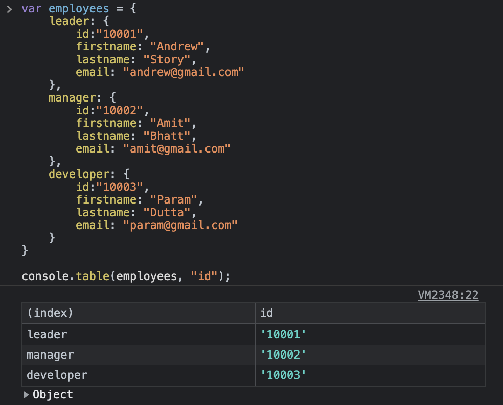 console.table()을 사용하면 배열과 객체를 테이블 형식으로 콘솔에 출력할 수 있습니다. 데이터를 표의 형식으로 보여주는 것은 매력적인 요소입니다. 즉, 데이터에 대한 더 많은 통찰력을 얻을 수 있고 코드를 더 빨리 디버그할 수 있습니다. 또한 표의 열을 빠르게 정렬할 수도 있습니다.