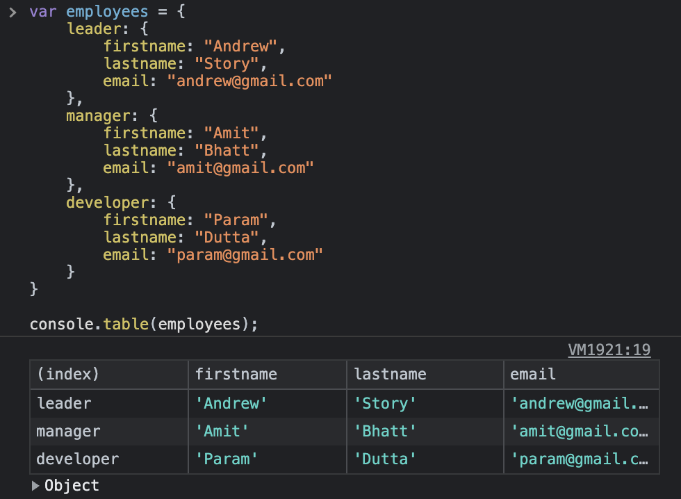 data 매개변수의 값이 중첩된 객체(속성 자체가 객체인 객체)인 경우 console.table() 메소드는 중첩된 객체 속성을 사용하여 index에 적절하게 레이블을 지정합니다.