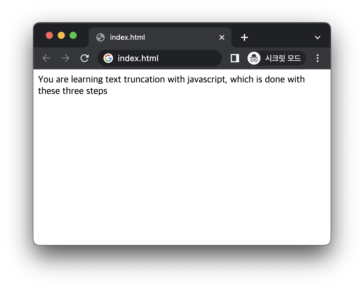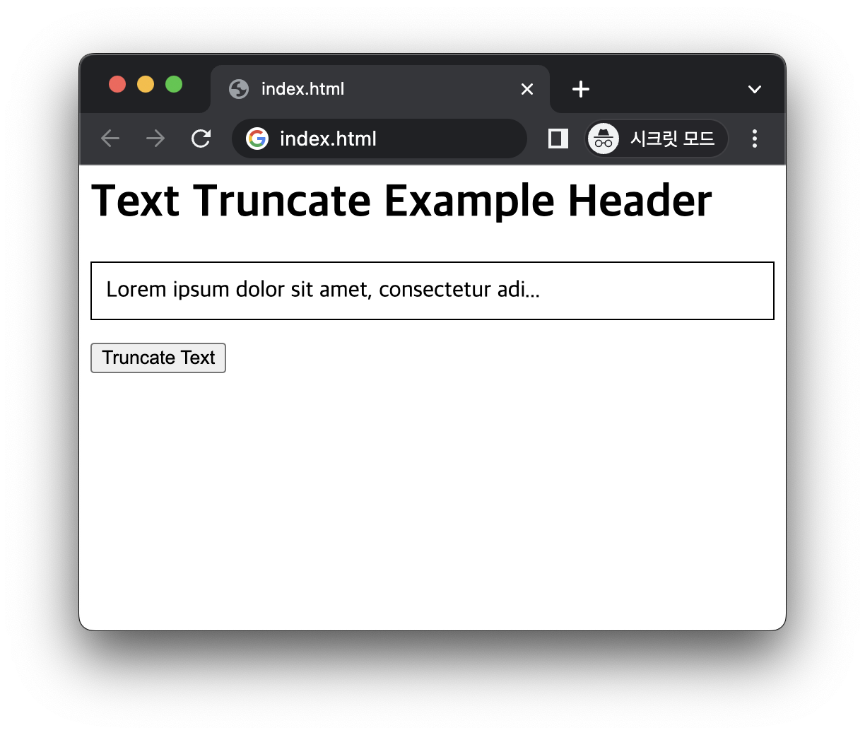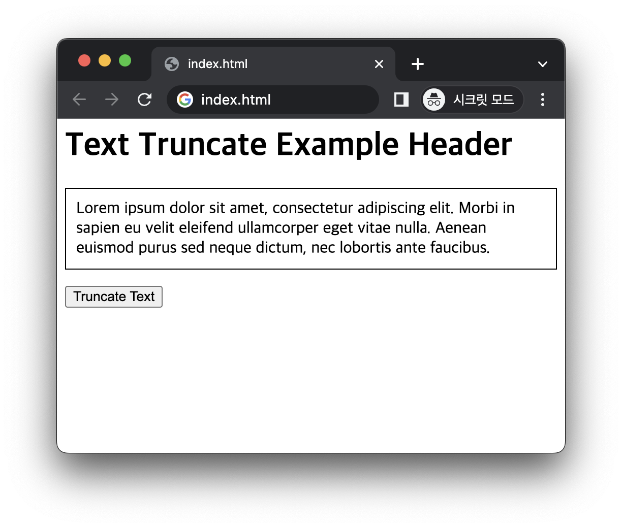 예제의 HTML 코드에 id가 "text"인 p 요소가 있습니다. JavaScript 코드의 truncateText() 함수는 p 요소에서 문자열을 검사합니다. 이 코드로 인해 "Truncate Text" 버튼을 누르면 문자열이 50 자로 잘리고 끝에 줄임표(...)가 추가됩니다. 다음은 버튼을 누른 후의 화면입니다.