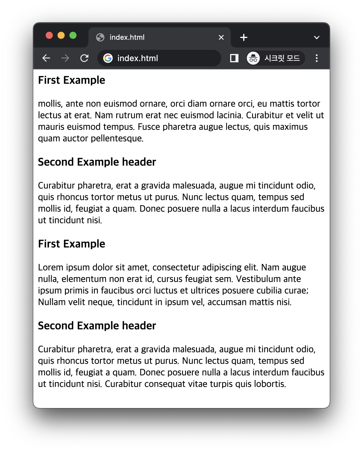 다음의 이미지는 CSS 적용 없이 위의 HTML을 실행한 화면입니다.