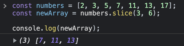 - end (옵셔널) - 가져올 부분의 끝 인덱스 입니다. 이 인덱스의 값은 새로운 배열에 포함되지 않습니다. 이 값을 안넣은 경우 기본 값은 배열의 마지막 인덱스가 됩니다.