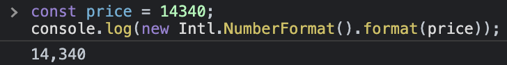 API나 외부 리소스의 데이터를 받아 쓸 때 일정한 포멧으로 받을 것 입니다. 예를 들어 쇼핑몰을 만들고 있다면 가격에 대한 데이터는 일정한 포멧으로 전달해 줄 것 입니다. 이러한 가격 데이터는 "14340" 이나 다음 배열과 같은 일반적인 숫자일 것 입니다: