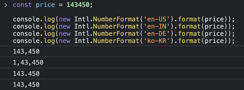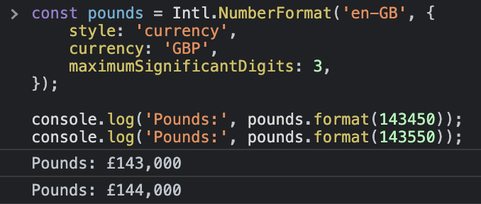 다른 옵션으로 maximumSignificantDigits가 있습니다. 이 속성을 통해 설정한 유효 자릿수를 기준으로 price 변수를 반올림한 결과를 얻을 수 있습니다. 예를 들어 이 속성을 3으로 설정하면 "143,450.00"은 "143,000"이 됩니다: