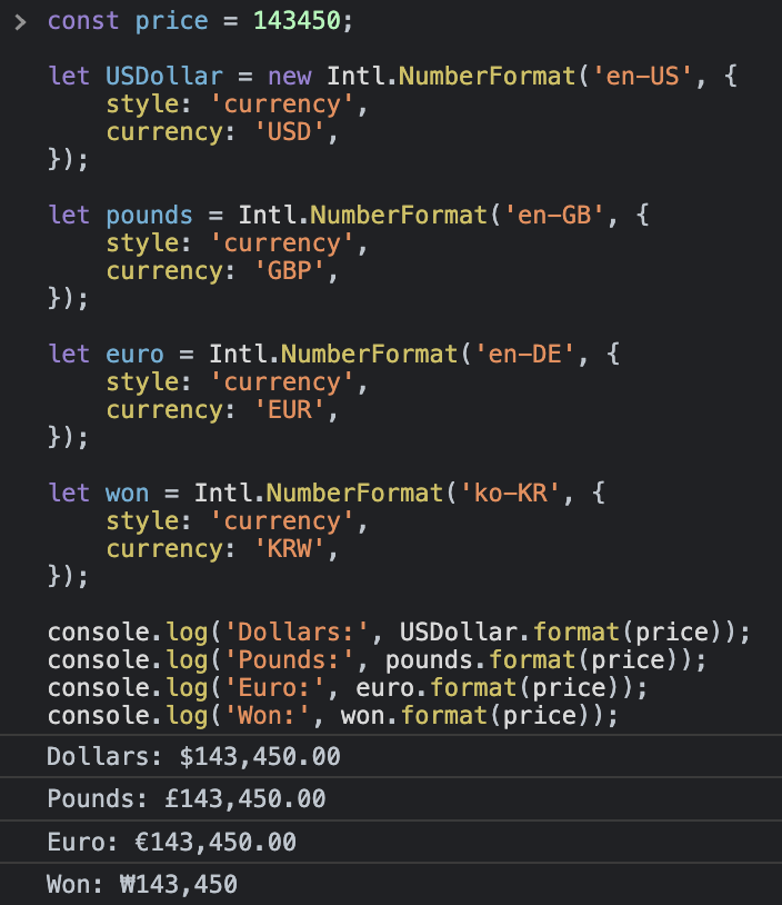 예를 들어 "14340"은 정의된 통화 표시, 로케일, 스타일에 따라 "$14,340.00"(미국 달러), "₹14,340.00"(루피), "€14,340.00"(유로) 등이 됩니다. 이는 JavaScript의 Intl.NumberFormat() 메소드를 사용하여 숫자를 통화로 변환할 수 있습니다.