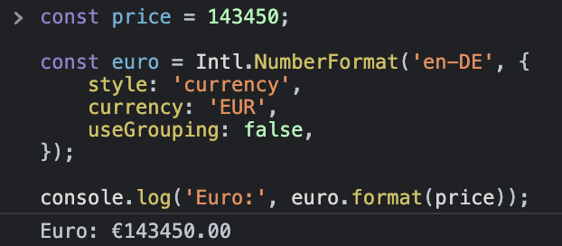 options의 속성에는 useGrouping 같이 거의 건드리지도 않을 것 같은 속성도 있습니다. 이는 숫자 중간에 콤마 같은 것으로 구분짓는 옵션으로 기본 값은 true 입니다. 이 옵션에 따라 $143,450.00과 같은 결과를 내게 됩니다. 이 옵션을 false로 설정하면 다음과 같은 결과를 얻을 수 있습니다: