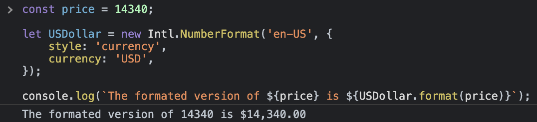 console.log(`The formated version of ${price} is ${USDollar.format(price)}`);