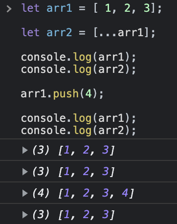 여기서 동일한 배열을 참조하지 않고 배열을 복사하고자 할 때 스프레드 연산자를 사용할 수 있습니다. 이렇게 하면 다음 예제와 같이 한 배열의 변경사항이 다른 배열에 반영되지 않습니다: