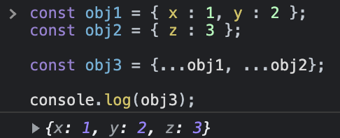 위의 예제에서 스프레드 연산자를 통해 obj1과 obj2의 속성이 obj3에 추가되었습니다.