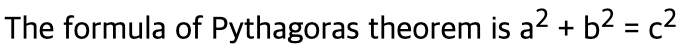 <p>The formula of Pythagoras theorem is a<sup>2</sup> + b<sup>2</sup> = c<sup>2</sup></p>