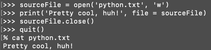위의 예제에서는 python.txt 파일을 쓰기 모드로 열었습니다. 만일 파일이 존재하지 않는다면 python.txt를 생성하고 쓰기 모드로 엽니다. 그 다음 sourceFile로 받은 파일 객체를 print() 함수의 file 매개변수로 전달합니다. 이렇게 하면 print() 함수의 objects로 전달된 값을 파일에 출력하게 됩니다.