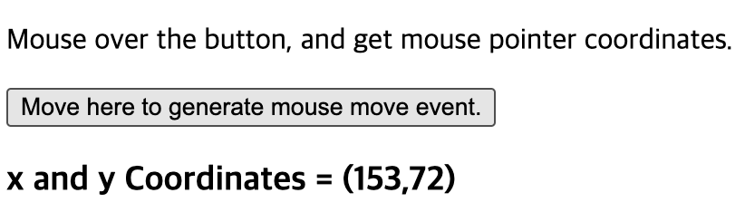 위의 예제에서는 버튼 위로 마우스를 이동하면 mouse move 이벤트가 처리됩니다. 버튼의 onmousemove 핸들러로 문자열 색상을 빨간색으로 변경하는 코드를 넣었고 사용자가 마우스 커서를 버튼 위로 이동하면 onmousemove 이벤트가 생성되고 버튼의 문자열이 빨갛게 변경됩니다.