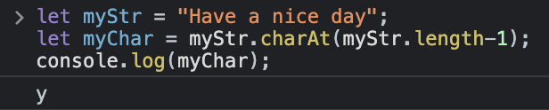이 예제에서는 charAt() 메소드를 사용하여 지정된 문자열의 마지막 인덱스에 있는 문자를 가져왔습니다. 마지막 문자의 인덱스는 String.length 속성을 사용하여 문자열의 길이를 얻고 인덱스의 시작 값은 0 부터 이므로 1을 뺍니다. 여기서는 마지막 인덱스에 'y'가 위치하므로 'y'를 리턴합니다.