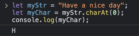 이 예제에서는 자바스크립트 charAt() 메소드를 사용하여 문자열의 첫 번째 문자를 가져왔습니다. 0 번째 인덱스에는 문자 'H'가 위치하므로 'H'를 리턴합니다.