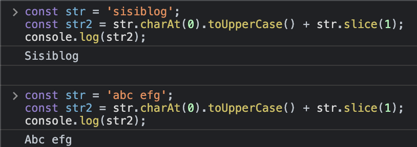 하지만 이는 첫 글자만 대문자로 바꾸고자 하는 우리의 목표가 아닙니다. 문자열의 첫 번째 문자만 대문자로 표시하려면 charAt() 메소드를 사용하여 첫 번째 문자를 분리한 다음 toUpperCase() 메소드를 사용하여 대문자로 바꿔야합니다.